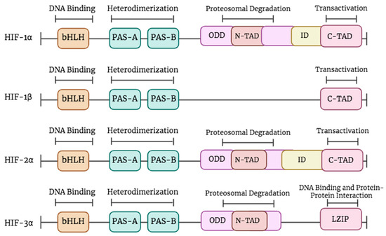 The HIF gene family consists of three isoforms, namely HIF-1, HIF-2, and HIF-3 [11,12]. Every isoform is composed of a dimeric configuration comprising an alpha (α) subunit sensitive to oxygen and a beta (β) subunit insensitive to oxygen. β subunits are collectively referred as aryl hydrocarbon receptor nuclear translocator (ARNT) [12] (Figure 1).
