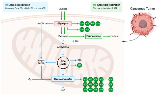 Overview of glucose metabolism in aerobic and anaerobic respiration. Glucose is the main energy source in the body in which it is converted to pyruvate to either be further converted and enter TCA cycle in aerobic conditions or be converted to lactate by fermentation in anaerobic conditions. Cancerous tumor cells demonstrated that the anaerobic respiration path tends to be followed regardless of whether there is enough oxygen present. Created in BioRender.
