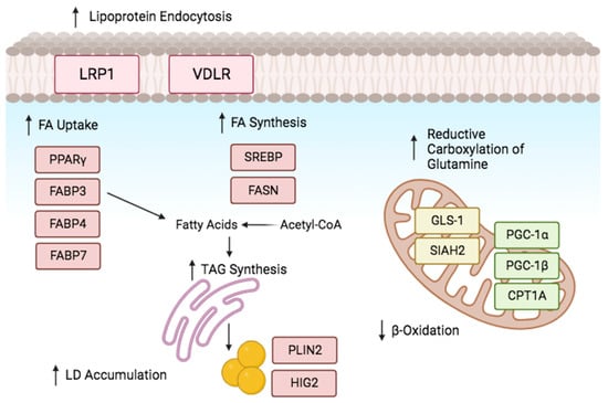 HIF-1α plays a prominent role in low oxygen levels by directly activating the transcription factor gene peroxisome proliferator activated receptor (PPARγ) [49]. This activation increases in TAG synthesis and facilitates the uptake of FAs by cells [50]. Moreover, it was found that fatty acid binding proteins FABP3, FABP7, and FABP4 play a role in enhancing fatty acid uptake in cancer cells and primary mouse hepatocytes [51,52]. Figure 4 demonstrates that HIF-1α enhances lipoprotein endocytosis by increasing the expression of specific receptors, such as low-density lipoprotein receptor-related protein (LRP1) in vascular smooth muscle cells and very low-density lipoprotein receptor (VLDLR) in cardiomyocytes [53,54].