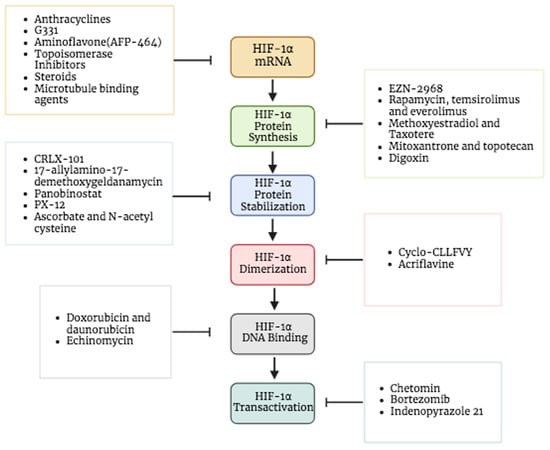 The first step considered in the HIF pathway is the transcription of HIF-1α. Many agents were identified to prevent its transcription [80]. For instance, anthracyclines and aminoflavone are drugs that showed effects inhibiting the HIF-1α mRNA expression. AFP-464 is a prodrug that is for the time being in phase I clinical trials; it contains the active ingredient aminoflavone, which almost entirely blocks HIF-1 protein expression but slightly inhibits HIF-1α mRNA expression [81,82,83]. This suggests that aminoflavone reduces the translation of HIF-1α as well as its stability. In addition to topoisomerase inhibitors, steroids and microtubule-binding agents are other drugs that exhibit the inhibitory effect of the HIF-1α mRNA expression rate by various mechanisms [81] (Figure 5).