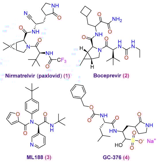 However, due to the rapid appearance of powerful viral varieties, novel therapeutic identifying techniques must be developed. Targeting SARS-CoV-2 using simple inhibitors that block viral polymerases and proteases, such as papain-like protease (PLpro), protease (3CLpro or Mpro), and RNA-dependent RNA polymerase (RdRp), has been the focus of the researchers []. Hence, the inhibitors that target 3CLpro and RdRp have made significant advances; several of these medications are either in studies or have received approval from the FDA [,,]. Consequently, remdesivir is the main FDA-approved drug for treating severe COVID-19 symptoms within the classification of RdRp inhibitors. Consequently, remdesivir is the main FDA-approved drug for treating severe COVID-19 symptoms within the classification of RdRp inhibitors []. Furthermore, molnupiravir affects by starting the initiation of viral RNA alterations, which eventually prevents SARS-CoV-2 from replicating. That is why molnupiravir is classified as an RdRp inhibitor using a drug-repositioning pathway []. Likewise, combining inhibitors that target cytochrome P450 3A4 and 3CLpro, paxlovid is FDA approved for treating individuals with light COVID-19 infection, including adults and children []. Despite the medications’ established efficacy, certain research has revealed genetic modification worries related to paxlovid and the development of viral resistance connected to remdesivir []. Furthermore, there are now worries about the possible development of 3CLpro mutations due to the appearance of new SARS-CoV-2 variants, among them Omicron. Such alterations could affect Paxlovid’s overall effectiveness []. In response to these challenges and to prevent the possible formation of SARS-CoV-2 resistance, various studies have recommended the possible use of a combined therapy treatment. Targeting other SARS-CoV-2 proteases, including PLpro and 3CLpro, is part of this strategy []. Drug development prospects are enhanced by virus-encoded proteases, namely the SARS-CoV-2 major protease (Mpro). As a cysteine protease that functions similarly to chymotrypsin, Mpro is essential for viral transcription and replication. Due to its functional importance, this protein is a significant target for developing potent antiviral medications. Its significance in the viral life cycle is highlighted by its function in converting polypeptides into functional proteins by cleaving polyproteins into replication-correlated proteins []. On the other hand, the protease’s bioefficacy is affected when the inhibitor and amino acids in the active region interact to inhibit substrate binding []. Consequently, creating Mpro inhibitors as antivirals presented several challenges for researchers. Despite these challenges, several effective compounds have been shown to bind to the Mpro catalytic active site, suggesting that they may be non-covalent Mpro inhibitors (Figure 1), including nirmatrelvir (paxlovid) (1), boceprevir (2), ML188 (3), and GC-376 (4) [,,]. Therefore, it has been thought that finding the protease inhibitors for COVID-19 is an essential first step in the fight against this infectious respiratory disorder.
