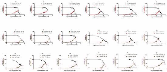 In the current investigation, pyrano[2,3-c]pyrazoles represented an innovative category of selective and effective human coronavirus 229E inhibitors. Eighteen pyrano[2,3-c]pyrazole congeners were gradually diluted and assessed to examine their influence on Vero-E6 cell growth and survival. Utilizing the MTT test, the cell viability of the Vero-E6 cell line was estimated after incubation for 48 h. By integrating the three different experiments’ mean dose–response curves, the 50% growth inhibitory and cytotoxic doses were calculated (Figure 2).