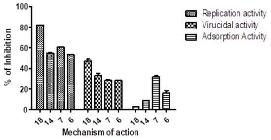 Compound 18, with a selectivity index of (12.6 M) successfully decreased HCoV-229E, making it a potential therapy for human HCoV-229E. The human HCoV-229E virus was suppressed by compounds 6, 7, and 14 with moderate selectivity indices of 7.6, 4.3, and 6.5 M, respectively. Compounds 1, 2, 3, 5, 9, 10, 11, 12, 15, 16, and 17 had minimal antiviral activity; however, compounds 4, 8, and 13 did not. The plaque assay, on the other hand, was used to determine the inhibitory effect mode of action for compounds with high or moderate activity. Compounds 18, 14, 7, and 6 exposed strong antiviral efficacies throughout the replication process with reduced percentages of up to 82.2%, 55%, 60.7%, and 53.6%, respectively. During the adsorption procedure, the same chemicals demonstrated no antiviral action. The four compounds had modest antiviral activity ranging from 28% to 42% (Figure 3).