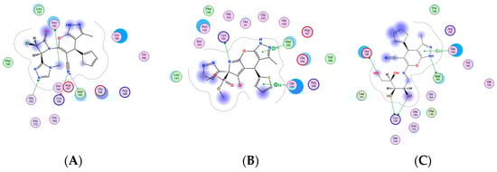 Two-dimensional (2D) interaction docking poses for (A) compound 6, (B) compound 7, and (C) compound 14.