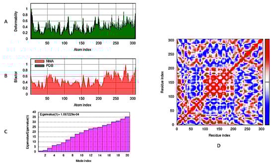 Compound 18/Mpro complex molecular dynamics simulation by iMODS server: (A) Deformability, (B) B−factor values, (C) eigenvalue, and (D) covariance model.