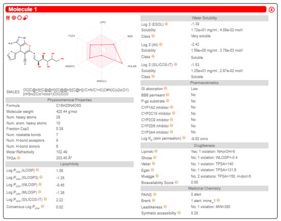 Compound 18’s ADME properties and physicochemical features (solubility, lipophilicity, polarity, size, flexibility, and saturation) were predicted using the Swiss-ADME web tool (http://www.swissadme.ch, accessed on 28 June 2023). The target compound 18 exhibited less lipophilic (LogP), soluble, and polar (TPSA) features. It has low GIT absorption without CNS side effects (cannot cross the BBB). There were no PAINS structural toxicity alerts []. The results assumed its ability to inhibit non-metabolizing enzymes (CYP2C9, CYP1A2, CYP2C19, CYP3A4, CYP2D6), indicating the hepatotoxicity’s non-existence, but it disclosed BRENK structural toxicity alerts due to the imine group existence. It was demonstrated that additional scaffold adaptations are seriously required in the future to improve oral bioavailability (Figure 8).