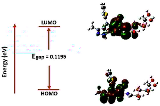 The molecular orbital energies are started as an excellent means for describing a molecule’s optical and electric properties using quantum chemistry. Frontier molecular orbitals (FMOs) are the highest occupied molecular orbital (HOMO) and the lowest unoccupied molecular orbital (LUMO) located at the molecules’ electrons’ outermost borders defining the conjugated molecules; FMO successfully explained the electron excitation from (HOMO) to (LUMO). HOMO energy (EHOMO) is used to estimate the electron–donor essence, whereas LUMO energy (ELUMO) is exploited in the electron–acceptor essence estimating. Correspondingly, lower LUMO and higher HOMO values match lower electron-acceptance resistance and electron–donor capacity. In Figure 10, the frontier molecular orbitals are exhibited where the molecule’s negative and positive phases are denoted as red and green-colored regions.