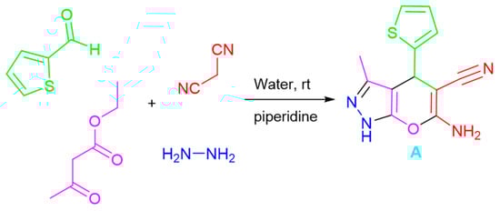 Synthesis of 6-amino-3-methyl-4-(thiophen-2-yl)-1,4-dihydropyrano[2,3-c]pyrazole-5-carbonitrile (A).