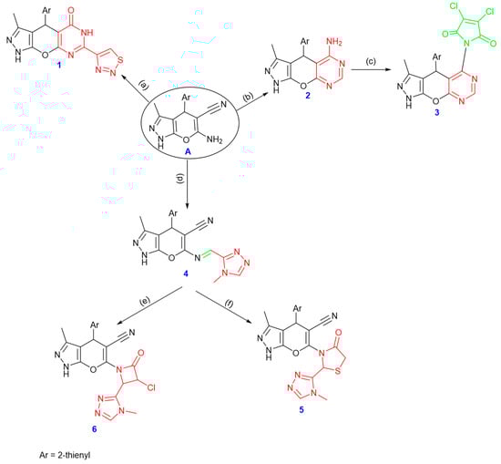 Synthesis of compounds 1–6, reagents and conditions: (a) 1,2,3-thiadiazole-4-carbaldehyde, DMF, ZnCl2, (b) formamide, (c) 3,4-dichlorofuran-2,5-dione, (d) 4-methyl-4H-1,2,4-triazole-3-carbaldehyde, ethanol, reflux, (e) thioglycolic acid, (f) chloroacetyl chloride.