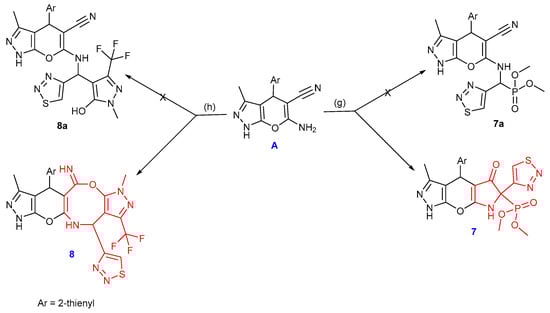 Synthesis of compounds 7 and 8, reagents and conditions: (g) 1,2,3-thiadiazole-4-carbaldehyde, CH3CN, LiClO4, RT, (h) 1,2,3-thiadiazole-4-carbaldehyde, 1-methyl-3-(trifluoromethyl)-1H-pyrazol-5-ol, EtOH, ZnCl2.