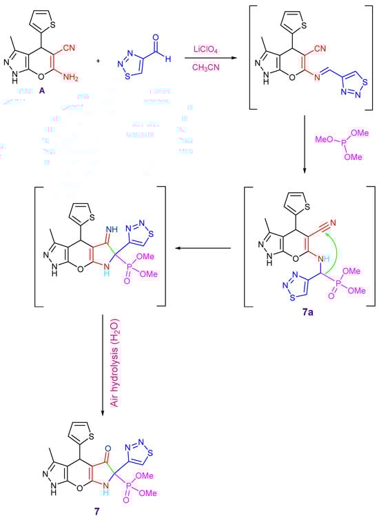 Additionally, dimethyl(3-methyl-5-oxo-6-(1,2,3-thiadiazol-4-yl)-4-(thiophen-2-yl)-4,5,6,7-tetrahydro-1H-pyrrolo[3′,2′:5,6]pyrano[2,3-c]pyrazol-6-yl)phosphonate 7 was produced through the reaction of the enaminonitrile A with 1,2,3-thiadiazole-4-carbaldehyde and trimethyl phosphite in the presence of lithium perchlorate as a catalyst in acetonitrile (Scheme 3).