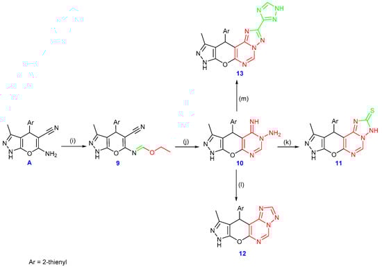 Synthesis of compounds 9–13, reagents and conditions: (i) triethyl orthoformate, acetic anhydride; (j) hydrazine hydrate, (k) CS2, KOH, (l) formic acid, and (m) 1H-1,2,4-triazole-3-carbohydrazide.