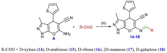 Moreover, Schiff bases 14–18 were formed by the condensation of several monosaccharides with compound A via refluxing in acetic acid. A range of spectral data was used to determine the structures of the compounds. The infrared spectra displayed absorption bands within the 3207–3385 cm−1 regions related to the hydroxyl groups. The protons of the sugar moieties were identified by the signals at δ 3.6–5.42 ppm in the 1H NMR spectra, while the doublet peaks at δ 8.56–8.58 ppm were also correlated with signals for the aromatic protons and the protons of the condensed sugar moieties (N=CH, C-1 methine). The suggested structures were also characterized by the 13C NMR spectra, which revealed the signals of the sugar moieties (cf. Scheme 6 and the experimental portion in the Supplementary File). Additionally, compound 18 showed high purity (99.92%) through the HPLC chromatogram.