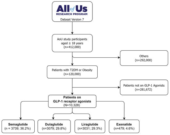 The study population was identified through a step-wise selection process from the All of Us research program database version 7, as depicted in Figure 1. The initial cohort comprised 412,000 patients aged 18 years or older. Only patients with a primary diagnosis of T2DM or obesity were considered (n = 120,000), while others were excluded (n = 292,000). The cohort was further restricted to those who received a GLP-1 RA prescription and used it for at least one month. This systematic identification process enabled the selection of a well-defined cohort of 10,328 new GLP-1 RA users with T2DM or obesity for analysis from the All of Us research program database. Of these, 36.2% were on semaglutide (n = 3739), 29.8% were on dulaglutide (n = 3079), 29.3% were on liraglutide (n = 3031), and 4.6% were on exenatide (n = 479).