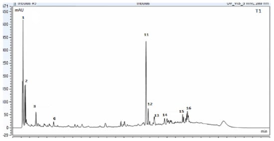 UPLC_PDA chromatogram for Tribulus terrestris sample (ELE: ethanolic leaf extract) at 280 nm. The confirmation of the indicated compounds was verified by MS technique (Peak number identity is displayed in Table 1).