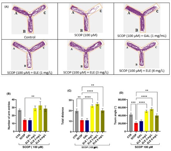 The Y-maze was used to evaluate spatial working memory in the amnesic fish. Figure 2 illustrates the memory impairment caused by SCOP as SCOP-treated fish spent minimal time in the novel arm. The administration of ELE demonstrated memory-enhancing effects in the amnesic fish. One-way ANOVA revealed a significant increase in spatial memory performance in groups treated with low and high doses (1, 3, and 6 mg/L) of Tt in terms of total distance traveled (F (8, 63) =11.33 (p < 0.0001 for 1 and 3 mg/L and p < 0.005 for 6 mg/L), time spent in the novel arm (% of total arm time F (8, 63) = 5.225, p < 0.01), and turn angle (one-way ANOVA F (8, 63) = 11.31, p < 0.001), with increased percentages compared to the group treated with SCOP alone, indicating significant effects on short-term memory. Further analysis using Tukey’s post hoc test revealed a significant difference between the control and SCOP groups (p < 0.0001), control and SCOP + ELE (1 mg/L) groups (p < 0.0001), SCOP and SCOP + ELE (3 mg/L) groups (p < 0.0001), and SCOP and SCOP + ELE (6 mg/L) groups (p < 0.001), indicating that ELE significantly improved spatial memory (Figure 2). Fish treated with ELE explored all three arms of the maze. These fish outperformed the GAL-treated group in terms of behavioral parameters. This improvement in spatial memory is consistent with previous studies investigating the effects of phytochemicals using the Y-maze test [38,39,40].