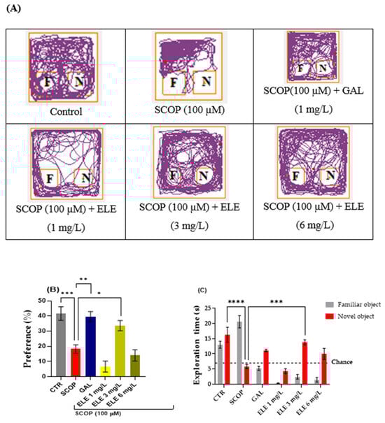 In this test, the object distinction task was performed to evaluate the recognition memory of the zebrafish. These vertebrates possess the capacity to differentiate between familiar and unfamiliar objects and remember three-dimensional geometric forms [36,41] Following the object discrimination test, we generated representative tracking plots illustrating the paths taken by the fish during the testing session, according to their respective experimental groups. The effects of the SCOP (100 µM) administration and ELE (1, 3, and 6 mg/L) treatments on NOR recognition memory and locomotion are illustrated in Figure 3 In the NOR test, the one-way ANOVA revealed a significant effect of the treatment on the preference percentages (F (8, 61) = 17.30, p < 0.0001) and exploratory time (F (17, 125) = 18.64, p < 0.0001)) (Figure 3B). The representative locomotion tracking plots disclosed changes in swimming behavior (Figure 3A). Compared to the control group, zebrafish treated with SCOP had lowered preference percentages for the novel objects (NOs), implying impaired recognition memory. Furthermore, ELE treatment (3 mg/L) increased preference percentages in SCOP-treated zebrafish (p < 0.05 (Figure 3), suggesting memory enhancement. As shown in Figure 3, SCOP-treated fish spent more time exploring the familiar object and less time exploring the novel object compared to fish from other groups. The one-way ANOVA indicated statistical significance (p < 0.05). According to Figure 3, the three doses of ELE, but especially the 3 mg/L dose, reversed the recognition memory deficits caused by SCOP administration by significantly (p < 0.05 and p < 0.01 for ELE (3 mg/L)) increasing the preference of the zebrafish for the novel object. The 3 mg/L doses of ELE demonstrated performance levels exceeding the chance level (50%), indicating a relative preference for the novel object. Therefore, the ELE improved recognition memory in zebrafish with SCOP-induced patterns of AD, as observed in the object distinction task. Saponins and flavonoids have been reported to improve recognition memory in experimental animals [42]. In one study, flavonoids rutin and naringin dose-dependently enhanced the discriminative ability of SCOP-treated animal models [43]. The present findings may be attributable to the abundance of such compounds.