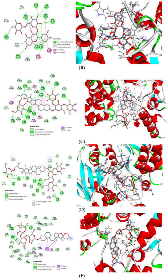 Using molecular docking, the interactions of the 15 compounds (Table 1 and Table S1) with AChE were visualized. The co-crystallized ligand donepezil was redocked into the active site of AChE (Figure 5A) to assess the accuracy of the docking. The root mean square deviation (RMSD) between the docking and original co-crystallized poses was 0.47 Å. The majority of the selected compounds exhibited favorable interactions with essential amino acid residues such as Tyr72, Asp74, Trp86, Tyr124, Ser293, Phe295, Phe297, Tyr337, Phe338, Tyr341, and Trp286. Interestingly, rutin, with a docking score of −24.68 kcal/mol, showed 11 conventional hydrogen bond interactions with the essential amino acids of the PAS and CAS regions: Tyr124 (1.64 Å), Phe295 (2.93 Å), Tyr341 (2.45 Å), Tyr341 (3.04 Å), His447 (2.85 Å), Asp74 (2.71 Å), Thr83 (2.79 Å), Asn87 (2.50 Å), Trp86 (3.12 Å), and Glu202 (3.05 Å and 3.22 Å). In addition, rutin forms six carbon–hydrogen bonds, two π-donor hydrogen bonds, and eight π-π-stacked bonds (Figure 5B, Table 3). Protodioscin displayed a binding mode similar to that of rutin and donepezil (co-crystal ligand). It formed 16 hydrogen bonds with 12 amino acids, ranging in length from 2.04 to 3.23 Å. Sugar moieties play a key role in the formation of hydrogen bonds with Trp286 (3.23 Å), Trp86 (3.20 Å), Tyr72 (2.97 Å), Asp74 (2.82 and 2.65 Å), Tyr124 (2.04 Å), Tyr341 (2.04 and 2.81 Å), Ser293 (2.15 and 2.60 Å), Asn87 (2.80 and 2.70 Å), Thr83 (2.57 and 2.78 Å), Glu202 (2.77 Å), and Glu292 (2.47 Å). The steroid portion of protodioscin contributed to 14 hydrophobic interactions through the formation of π-Sigma or π-Alkyl interactions (Figure 5C, Table 3). Additionally, saponin C (Figure 5D, Table 3) and terrestrosin C (Figure 5E, Table 3) exhibited extremely low binding energies of −24.11 and −24.63 Kcal/mol, respectively. Their steroid moieties exhibited hydrophobic interactions with Try72, Try286, Phe297, Phe338, and Try341 in the PAS region of the AChE enzyme. Furthermore, saponin C and terrestrosin C formed twelve and twenty-one hydrogen bonds, respectively.