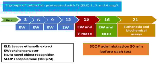 Zebrafish were divided into the following groups: three Tt pretreatment groups including three concentrations (ELE): 1, 3, and 6 mg/L; the control group (DMSO 1% was added via immersion); the SCOP group (SCOP, 100 µM, Sigma–Aldrich, Darmstadt, Germany); and the galantamine (GAL) group (GAL, 1 mg/L, Sigma–Aldrich, Darmstadt, Germany) serving as a positive control in the Y-maze and NOR tests. The doses of SCOP, GAL, and plant extract were selected based on previous studies [60]. ELE (1, 3, and 6 mg/L) was administered through immersion once daily in a 6 L glass for 1 h, while SCOP (100 µM) was administered 30 min preceding the behavioral tests (Figure 6).