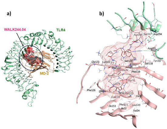 A comprehensive overview of the positive control (WALK244.04) interactions with its receptor: (a) TLR4/MD2-WALK244.04 docked complex; (b) 3D binding pocket interactions.