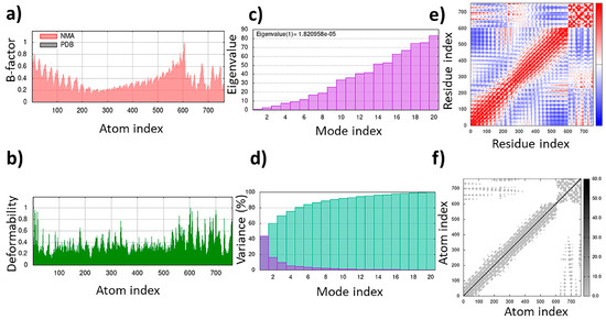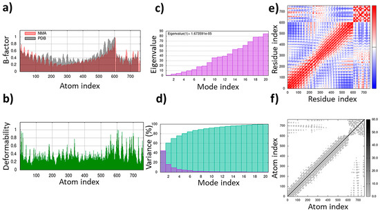 Molecular dynamics simulation of the TLR4/MD2-MRh4-679 complex as the universal immunoadjuvant: (a) B-factor; (b) deformability; (c) eigenvalues; (d) variance; (e) covariance matrix; (f) elastic network map.