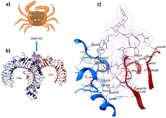SPalf2-453 (HIRRRPKFRK) is a crab-derived immunomodulator with antiviral properties: (a) Scylla paramamosain; (b) comprehensive overview of TLR1/TLR2-SPalf2-453 docked complex; (c) ligand–receptor 3D interactions in the binding pocket.