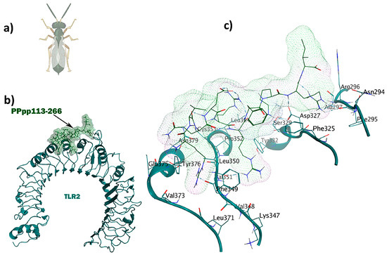 The PPpp113-266 ligand (RVQERRFKRI) derived from the wasp shows simultaneous immunomodulatory and antitubercular properties: (a) Pteromalus puparum; (b) visualization of the TLR2-PPpp113-266 docked complex; (c) 3D interactions of the ligand–receptor in the binding pocket.