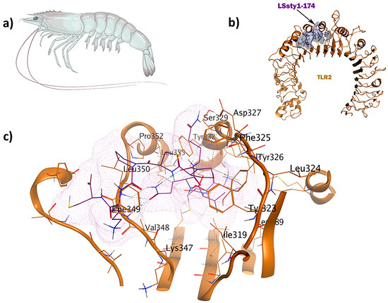 The LSsty1-174 ligand (PCVQQPCPKC) derived from shrimp has immunomodulatory and antifungal properties: (a) Litopenaeus stylirostris; (b) visualization of TLR2-LSsty1-174 docked complex; (c) 3D interactions of the ligand–receptor in the binding pocket.