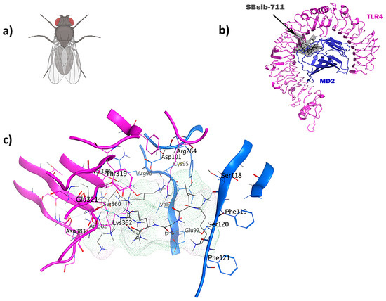 The SBsib-711 ligand (KLKRGAKKAL) from a black fly has immunomodulatory and anticancer characteristics: (a) Simulium bannaense; (b) visualization of the TLR4/MD2-SBsib-711 docked complexes; (c) ligand–receptor 3D interactions in the binding pocket.