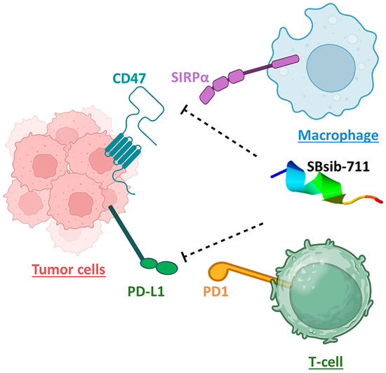The anticancer peptide SBsib-711 is putatively an immune checkpoint inhibitor. It binds CD47 and PD-L1 on tumor cells and prevents CD47/SIRPα and PD1/PD-L1 interactions allowing the macrophage and activated T-cells to attack tumor cells, respectively.