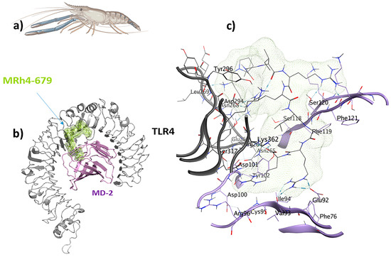 The MRh4-679 ligand (KPAIRRLARR) originated from a shrimp with immunomodulatory, antiviral, antifungal, antitubercular, and antiangiogenic properties and is suitable as a universal immunoadjuvant: (a) Macrobrachium rosenbergii; (b) visualization of the TLR4/MD2-MRh4-679 docked complex; (c) ligand–receptor 3D interactions in the binding pocket.