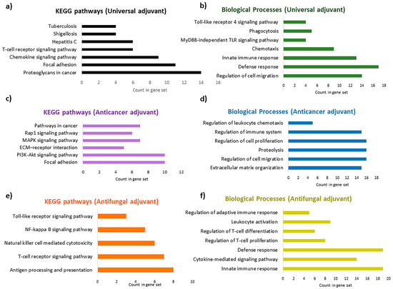 Enriched Gene Ontology (GO) terms for biological processes (BPs) and KEGG pathways for the most optimal adjuvants: (a) enriched KEGG pathways for the universal adjuvant, MRh4-679; (b) enriched BPs for the universal adjuvant, MRh4-679; (c) enriched KEGG pathways for the anticancer adjuvant, SBsib-711; (d) enriched BPs for the anticancer adjuvant, SBsib-711; (e) enriched KEGG pathways for the antifungal adjuvant, LSsty1-174; (f) enriched BPs for the antifungal adjuvant, LSsty1-174.