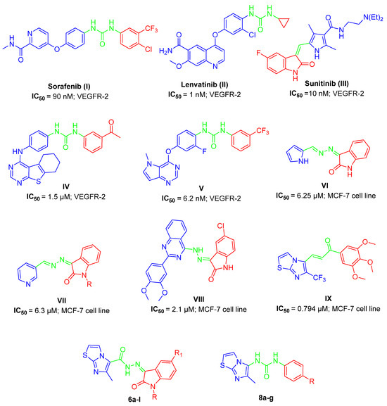 As illustrated in Figure 1, isatin in Sunitinib (III) and lead compounds VI–VIII, in addition to the imidazo[2,1-b]thiazole system in the potent anticancer compound IX, are important in the synthesis of potent VEGFR-2 inhibitors and/or MCF-7 anticancer agents. On the other hand, the hydrazine linker in compounds VI–VIII and urea bridge in Sorafenib (I), Lenvatinib (II), IV and V are critical for the same purpose.