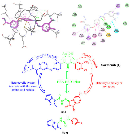 Docking of Sorafenib (I) with VEGFR-2 binding site and the assumed possible modifications of the targeted structures 6a–l and 8a–g.
