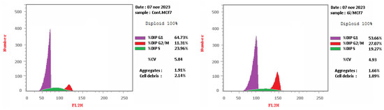 Cell cycle for cont. MCF-7 (left) and 6i (right).