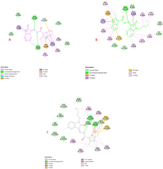 (A) 6b in VEGR-2 binding site showed H-bond with Asp1046 and pi-cation interaction with Lys868; (B) compound 6i revealed H-bond with Asp1046, pi-sigma interaction with Cys1045 and pi-cation interaction with Lys868; (C) 6j showed H-interactions with Asp1046 and Lys868 residues (Table S1, Supplementary Data).
