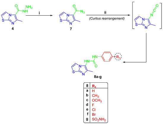 Compound 4 was stirred for 3 h in a solution of NaNO2 with HCl to form the 6-methylimidazo[2,1-b]thiazole-5-carbonyl azide [41]. Azide 7 (0.21 g, 1 mmol) was refluxed in 1,4-dioxane (40 mL) with different anilines (1.0 mmol) for 8 h. Crystallization from EtOH for the formed solid gave the targeted urea derivatives 8a–g, respectively.