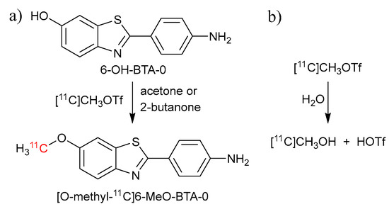 - Wilson, A.A.; Garcia, A.; Chestakova, A.; Kung, H.; Houle, S. A Rapid One-Step Radiosynthesis of the β-Amyloid Imaging Radiotracer N-Methyl-[11C]2-(4′-Methylaminophenyl)-6-Hydroxybenzothiazole ([11C]-6-OH-BTA-1). J. Label. Compd. Radiopharm. 2004, 47, 679–682. [Google Scholar] [CrossRef]