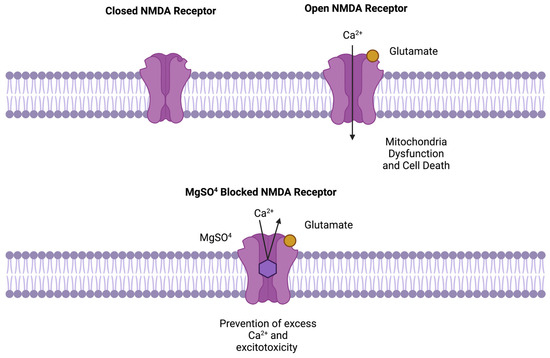An illustration of magnesium sulfate’s action at the N-methyl-d-aspartate (NMDA) receptor. Top left shows a closed NMDA receptor; top right shows an NMDA receptor opened via extra-cellular glutamate, allowing calcium (Ca2+) to enter the cell. Ca2+ influx can lead to over excitation, mitochondrial dysfunction, and cell death. Bottom shows MagSul (MgSO4) blocking the calcium channel of an open NMDA receptor, thus preventing excitatory glutamatergic effects. Created with BioRender.com. Accessed 30 January 2024.