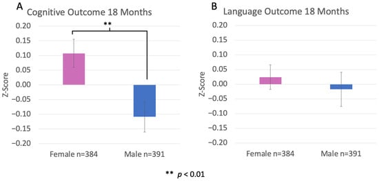 Sex difference in cognitive and language outcomes at 18 months. We report a significant difference between males and females in cognitive performance ((A), p < 0.01), with females showing better scores. This difference was not significant for language ((B), p > 0.05). Adapted with permission from [34].