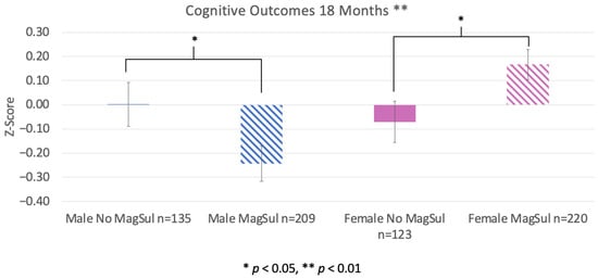 Differences between sexes for MagSul (magnesium sulfate) treated vs. untreated (no MagSul) on language outcomes at 18 months. There was an overall significant difference between all groups (p < 0.05). We further saw a significant difference for MagSul-treated males vs. untreated (p < 0.05), with treated males having a significantly lower cognitive performance at 18 months. A similar difference was not seen for females. Decade and preeclampsia were run as covariates.