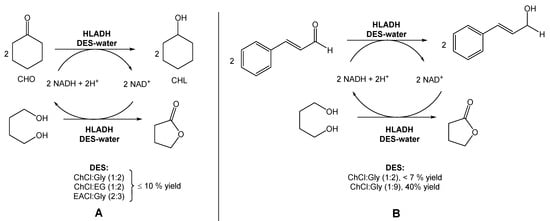 In a different report, Bittner et al. investigated the use of ChCl:Gly (1:2), ChCl:EG (1:2), and EACl:Gly (2:3) for the reduction of cyclohexanone into cyclohexanol, also using HLADH (Scheme 2A) [19]. In this study, contrarily to Chanquia’s work, the authors added 1,4-butanediol to the DES mixture. Their findings suggested that, in this case, the use of pure glycerol would be the best choice to achieve the maximum reactivity. However, the high viscosity of glycerol limits its applicability in these reactions. Therefore, the use of glycerol-based DESs provided less solvent viscosity and facilitated the manipulation of glycerol–water mixtures. Inspired by these results, the authors used a DES composed of choline chloride and glycerol, but with a higher glycerol content (1:9) to evaluate the reduction of cinnamaldehyde to cinnamyl alcohol (Scheme 2B). The use of this new DES allowed them to reach a 2.5-fold higher specific activity and a 40% conversion, instead of less than 7% when using a DES with a lower content of glycerol (ChCl:Gly (1:2)).