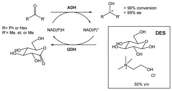 A DES composed of choline chloride and glucose (1.5:1) was also employed for the bioreduction of ketones into alcohols, using different alcohol dehydrogenases (ADHs) (Scheme 3) [20]. The ratio selected between the two components was chosen so that glucose could be used for cofactor recycling. Furthermore, Mourelle-Insua et al. studied the combination of an aqueous buffer with the DES at up to 50% (v/v) [20]. The use of such high NADES concentration showed two main advantages. First, the presence of glucose enabled the nicotinamide cofactor recycling. Then, the authors were able to conduct the reaction in much higher substrate concentrations in comparison with the buffer system employing glucose/glucose dehydrogenase (GDH). This strategy allowed them to obtain the desired products with >99% conversion and >99% ee.