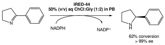 Recently, Arnodo et al. reported the use of IREDs in DESs for the reduction of cyclic imines into amines (Scheme 5) [30]. In this study, they started by using a choline chloride:glycerol DES (1:2) using the IRED-44 enzyme. They observed that when the reaction was carried out in pure DES, which has a lower viscosity when compared with other DESs, it was not possible to recover the desired product, even when using a high concentration of the substrate. Therefore, they attempted to use a 50% (v/v) DES solution in phosphate buffer (PB), which is the optimal amount of DES used in other studies using other reductase enzymes, such as KREDs. This change in the protocol led to the recovery of the product in good yield in both PB and DES/PB mixtures, even at low concentrations of the substrate.