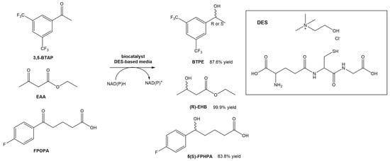 Wang et al. designed a new DES composed of choline chloride and glutathione, and utilized it for the asymmetric reductions of 3,5-bis(trifluorometyl) acetophenone (3,5-BTAP), an important intermediate in the preparation of (R)-[3,5-Bis(trifluoromethyl)phenyl]ethanol ((R)-BTPE), which is a building block in the synthesis of antiemetic drugs used to prevent chemotherapy-induced side effects, such as aprepitant and fosaprepitant (Scheme 6) [31]. In this study, the authors reported the use of whole cells of Trichoderma asperellum ZJPH0810. Similarly to other studies using DESs in biocatalytic processes, also in this report the authors were able to significantly increase the concentration of the substrate (up to a 2-fold increase). Comparing the reaction in the absence or presence of the DES in the solvent, the yield increased from 53.1% to 70.8%. The authors even compared the effect of replacing the DES with the [BMIM][PF6] ionic liquid. In terms of substrate concentration, the use of a DES-based medium and an IL-based medium allowed the use of higher concentrations (70 mM—IL vs. 100 mM—DES). In terms of conversion yield, the presence of ChCl:GSH afforded higher values (87.6%) than using the [BMIM][PF6] ionic liquid (82.5%). Later, they tested the same DES in other conversions, namely the reduction of ethyl acetoacetate (EAA) and 5-(4-fluorophenyl)-5-oxopentanoic acid (FPOPA) (Scheme 6). In the first case, the conversion of EAA in EHB resulted in similar results (83.8% yield and >99 ee%) when the reaction was performed in a DES-based medium and water, although faster. In the second case, the biocatalytic reduction of FPOPA in the presence of the DES resulted in significantly higher reaction yields than in water, after the same reaction time (83.9% vs. 65.9%). Both reactions were carried out with the same substrate concentration and reaction time. In this work, the authors showed that the ChCl:GSH system is a promising cosolvent for bioreductions.