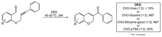 Recently, Annes et al. explored the use of DESs in ACM reactions for the synthesis of 2H-chromene derivatives (Scheme 13). The orto-progylated salicylaldehyde served as the starting material for the metal-free ACM reaction under mild reaction conditions [76]. Many literature-known DESs, such as ChCl:Urea (1:2), ChCl:Glycerol (1:2), ChCl:Ethylene glycol (1:2), and ChCl:pTSA (1:2), were tested as alternative catalysts for this metathesis, under different temperatures and reaction times. Only the mixtures containing pTSA provided the desired chromene in quantities higher than trace amounts. Of all the assessed reaction conditions, the best optimized yield (93%) was obtained using ChCl:pTSA (1:2) at 45–50 °C, with a reaction time of 8 h. Increasing the reaction time to 24 h slightly decreased the yield by 1%.