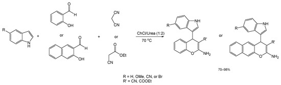 - Alvi, S.; Alam, M.; Ali, R. A facile catalyst-free one-pot three component synthesis of pharmacologically important indole-centered 4H-chromenes in a deep eutectic solvent (DES). J. Mol. Liq. 2023, 390, 122951. [Google Scholar] [CrossRef]