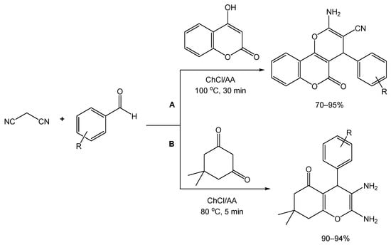 - Zohreh Valipour Rahman Hosseinzadeh, Y.S.; Maleki, B. Natural Deep Eutectic Solvent as a Green Catalyst for the One-pot Synthesis of Chromene and 4H-Pyran Derivatives. Org. Prep. Proced. Int. 2023, 1–13. [Google Scholar]