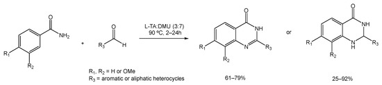 - Ghosh, S.K.; Nagarajan, R. Deep eutectic solvent mediated synthesis of quinazolinones and dihydroquinazolinones: Synthesis of natural products and drugs. RSC Adv. 2016, 6, 27378–27387. [Google Scholar] [CrossRef]