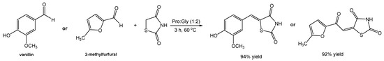 - Hesse, S. Synthesis of 5-arylidenerhodanines in L-proline-based deep eutectic solvent. Beilstein J. Org. Chem. 2023, 19, 1537–1544. [Google Scholar] [CrossRef] [PubMed]